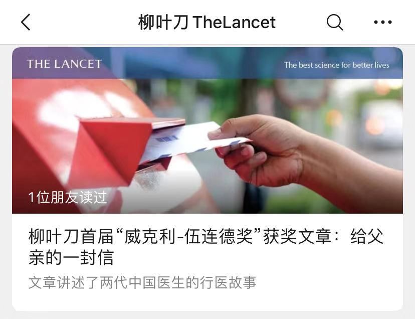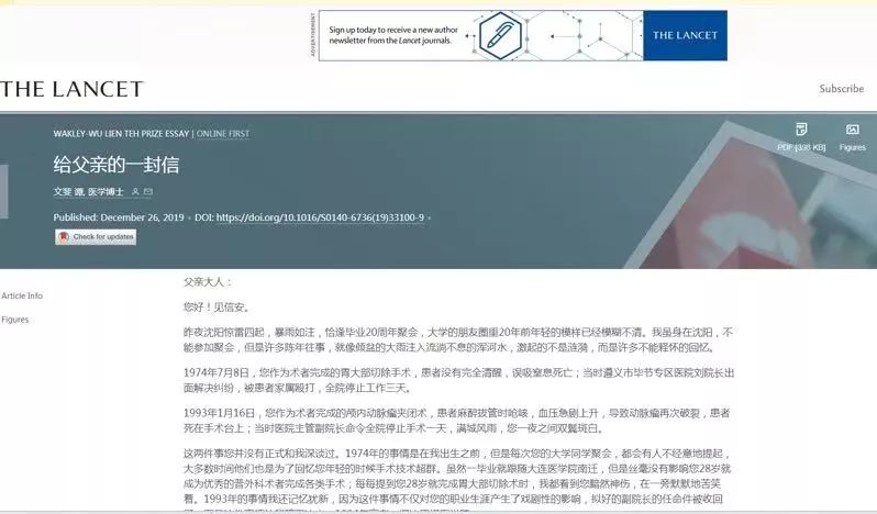 国际医学期刊《柳叶刀》(The Lancet)于26日在其官网以中文形式发布了一篇中国学者的文章——《给父亲的一封信》。