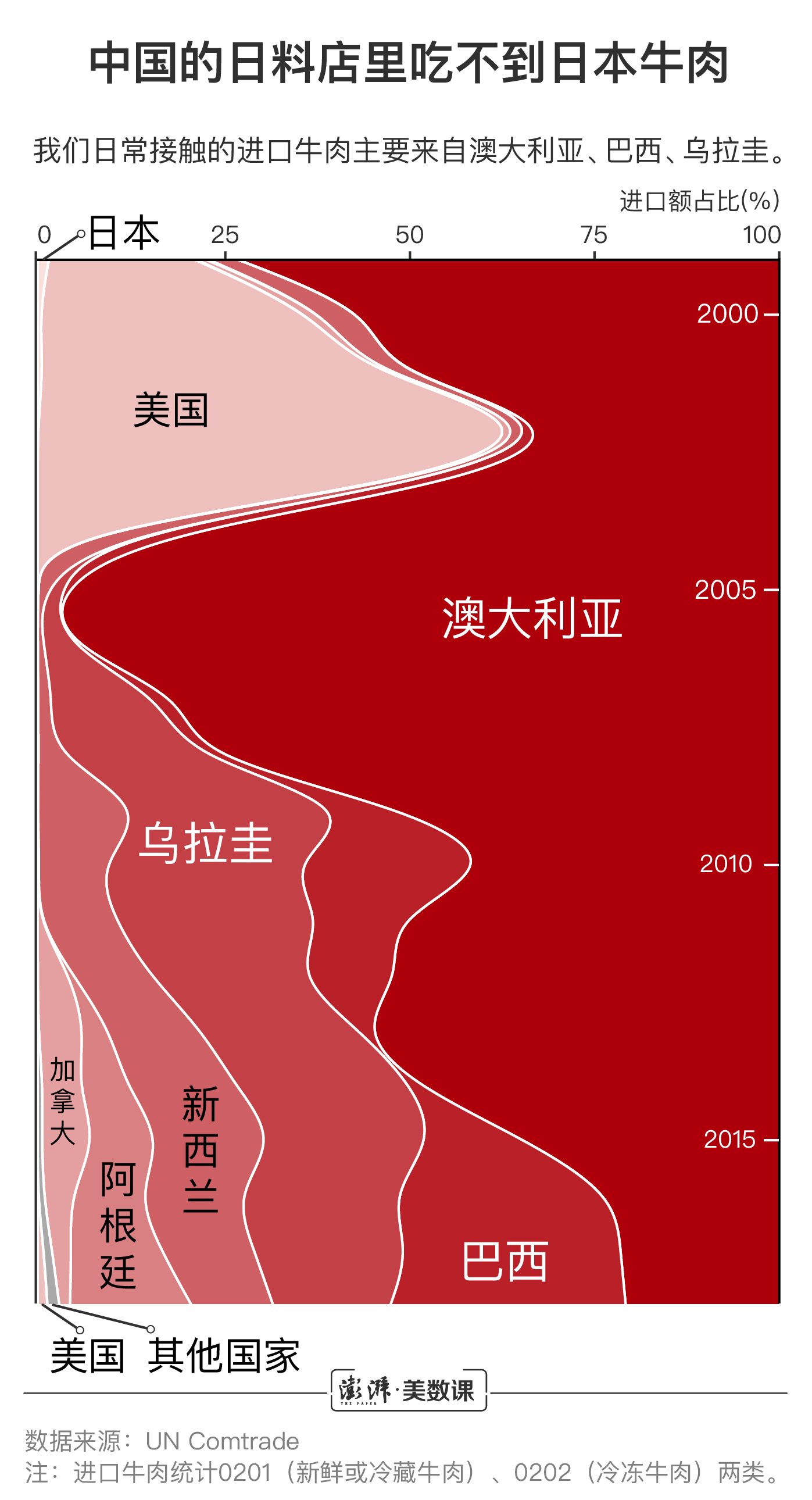 因此,从正常的进口途径来看,在过去的18年时间里,中国人的餐桌上应该吃不到日本产的牛肉,当然也包括日本和牛。我们日常接触的进口牛肉主要来自澳大利亚、巴西、乌拉圭等国。