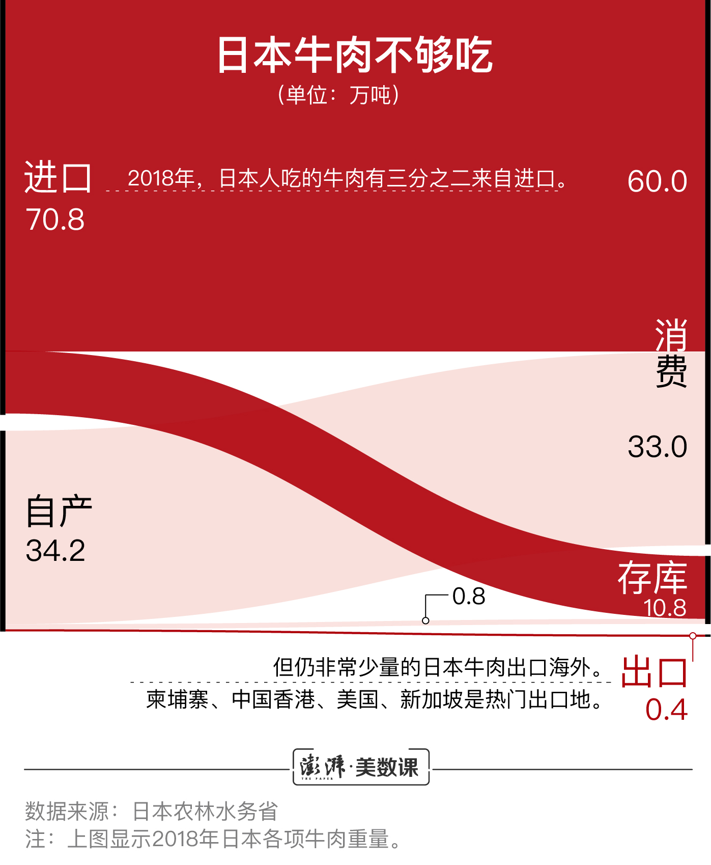 从日本农林水务省的统计数据来看,日本自产牛肉确实不够吃,日本需要进口一些牛肉,保持国内供需平衡。但是仍然有少量日本产牛肉会出口到海外。以2018年的情况为例,日本牛肉出口量最大的国家是柬埔寨。中国香港、美国、新加坡、泰国也是热门出口地。