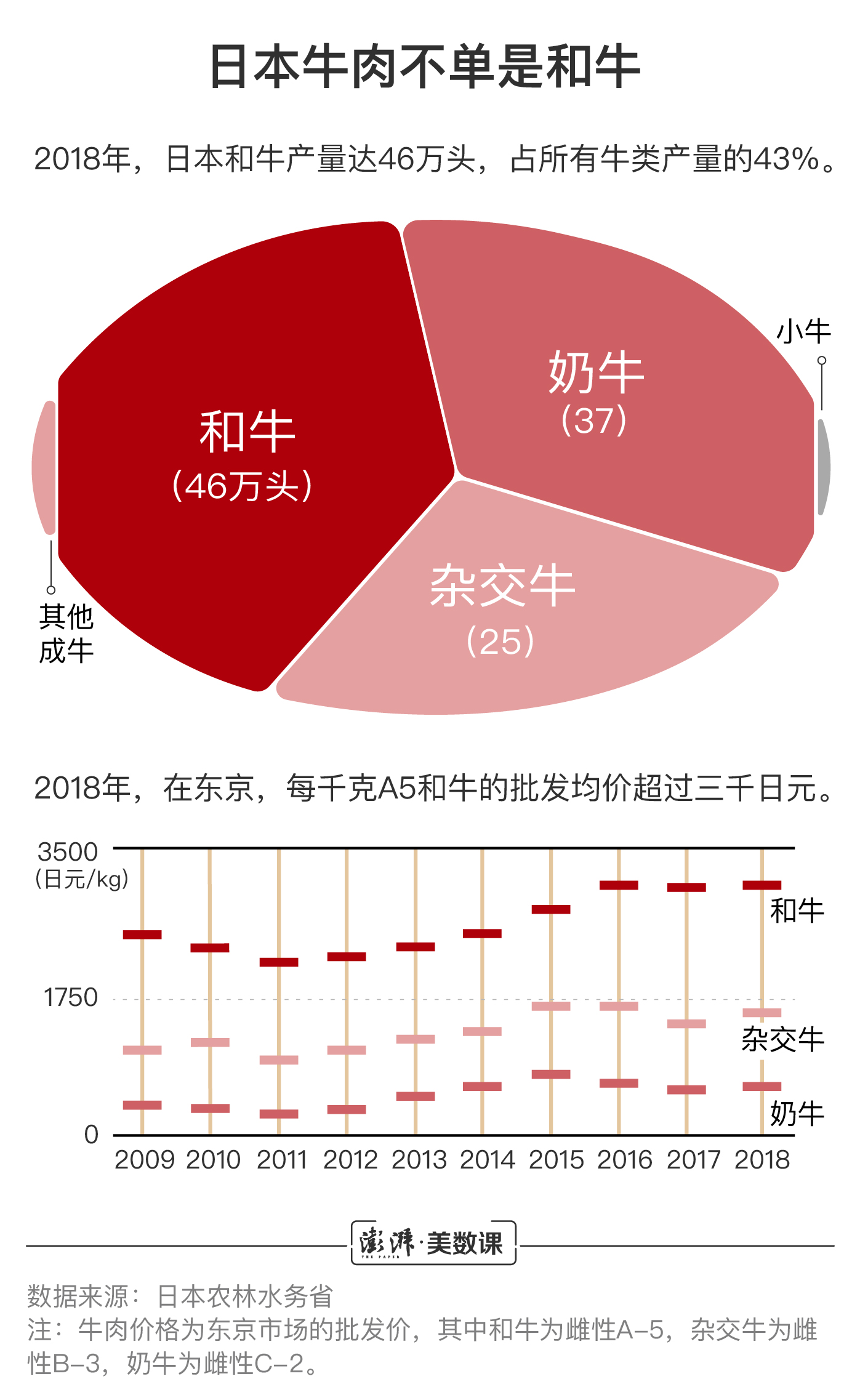 和牛确实价格不菲。2018年,一千克A5等级(最高等级)的和牛在东京批发价超过3000日元,也就是192元人民币。相对而言,奶牛价格比较亲民,普通人也完全吃得起。而杂交牛的价格处于奶牛和和牛之间。