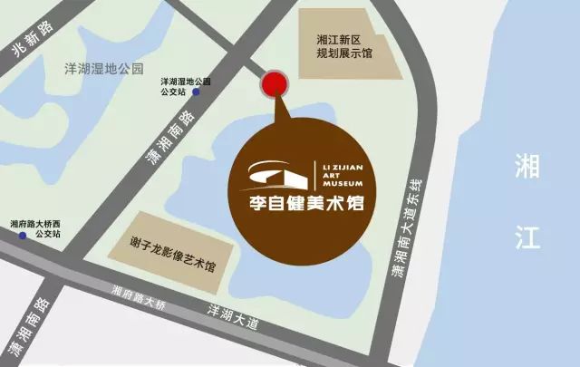 停车:美术馆东面停车场、美术馆西面的洋湖湿地公园停车场或美术馆北面湘江新区规划展示馆停车场。