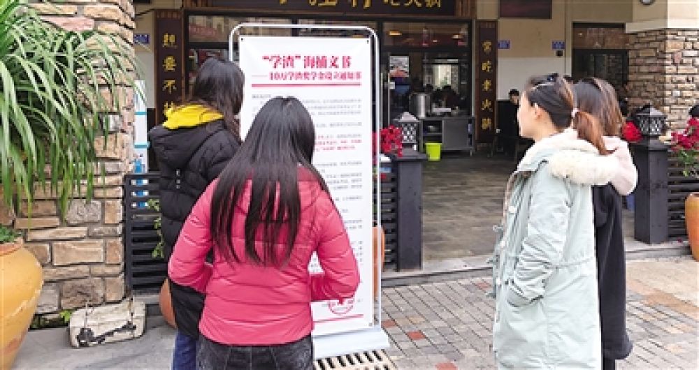 ↑火锅店门外,市民正在围观“学渣”奖学金活动公告。