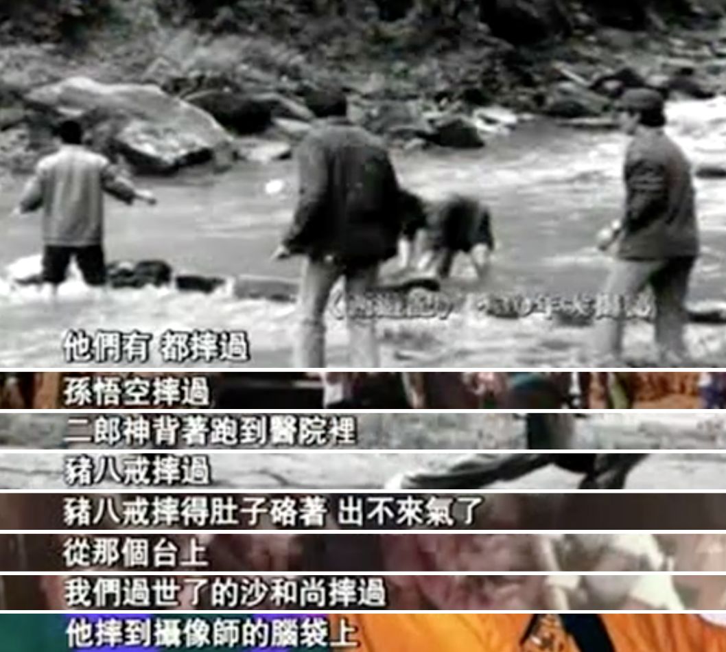 六小龄童曾经从四五米的高空中直接摔下来,体重170多斤的“沙僧”闫怀礼有一次直接摔在了摄像王崇秋的脑袋上,王崇秋当场被砸晕了过去。