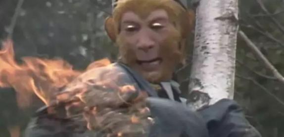 “大战红孩儿”中,孙悟空被火烧了。这一幕也是很真实的拍摄。图片来源:82版《西游记》视频截图