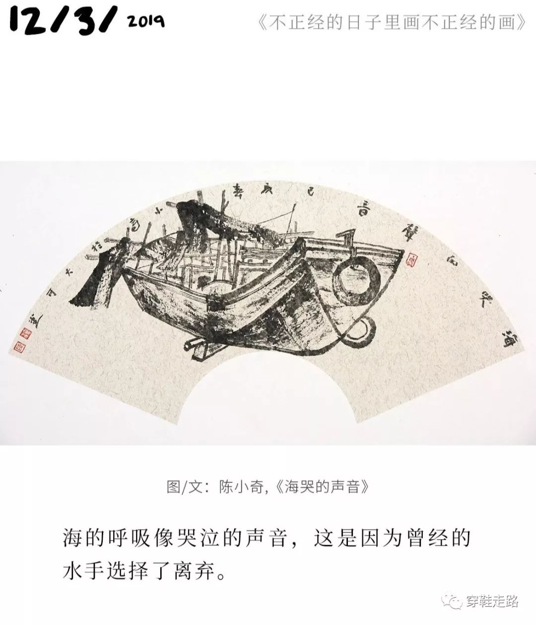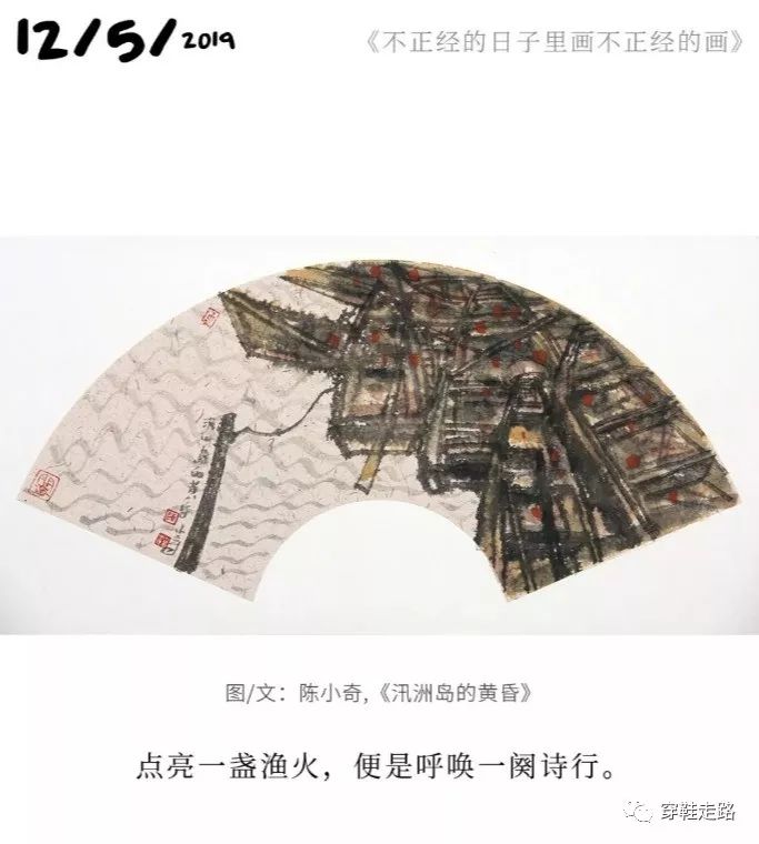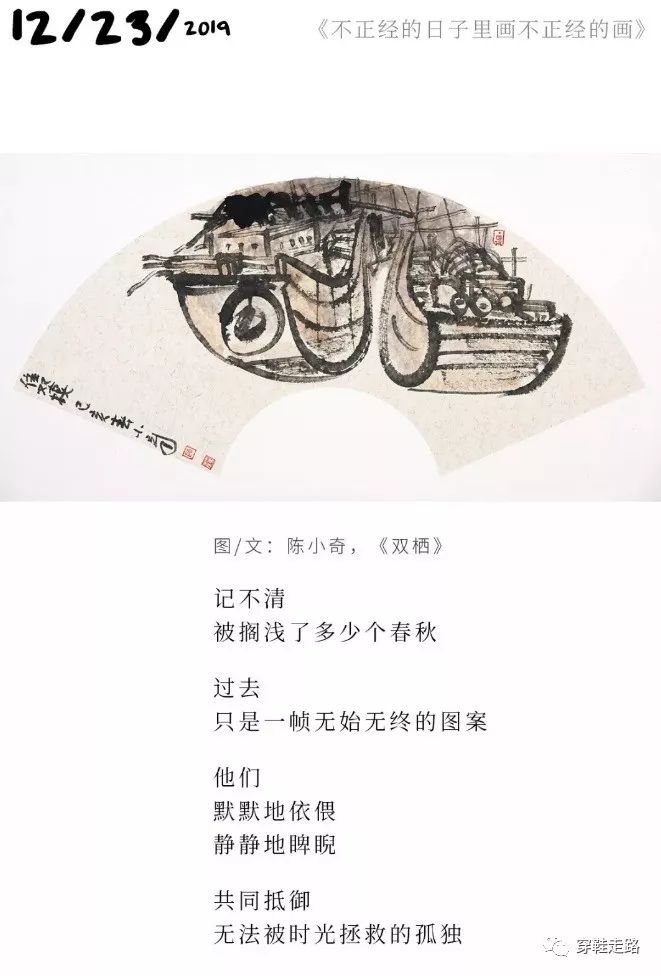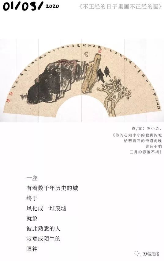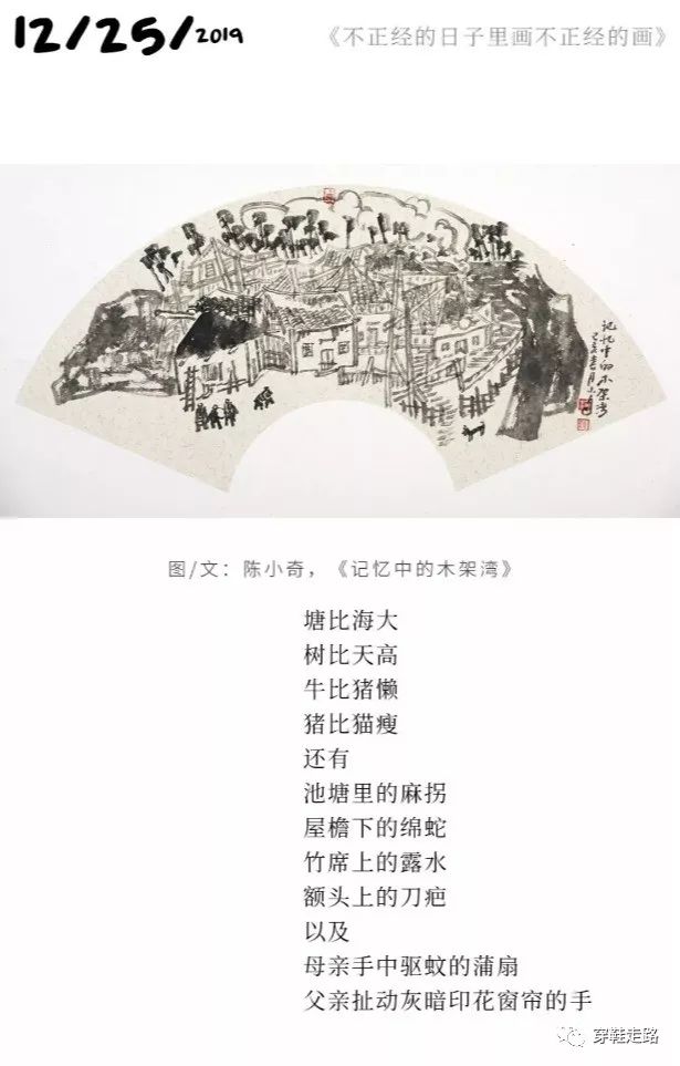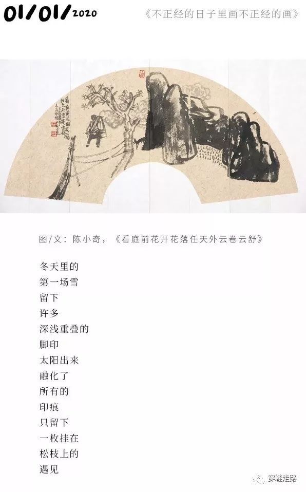 碌碌如我,只好跟在他的脚印后,默默拾起这个冬季中不多的诗意温暖,如拾起那些飘落的金黄树叶。幸好,经过他女儿的推发,看一幅画,品一段文,就可以方便地回看前面的扇画。使这个诗意的跟踪不致断了线索。
