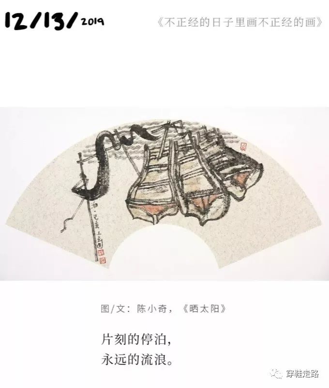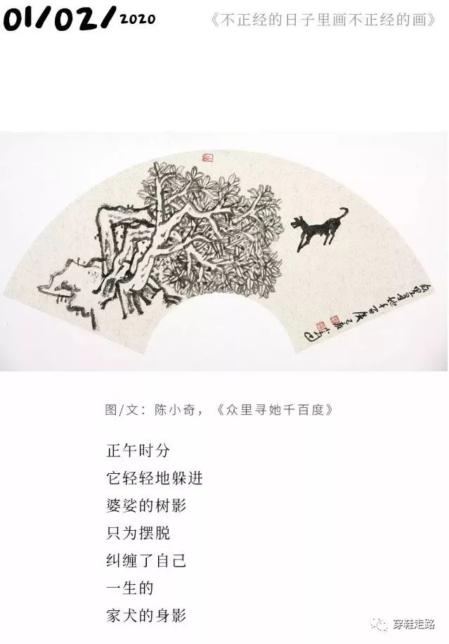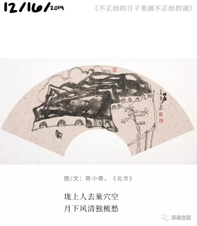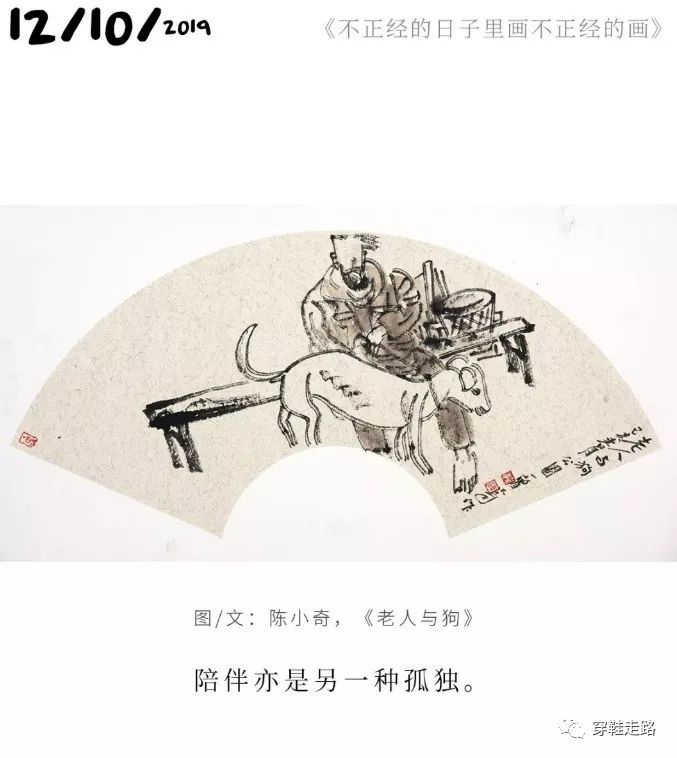 退休后的小奇,每潜伏一段时间后,就捧出一份惊奇。从《一只更年期的猫》60幅画及60段文系列,到巨幅画作《湘江古岸》,从祁连山下的60幅人物素描,到赴日本展览的几十幅写意小品,大的小的,一亮相就让人惊羡。在这个冬天,持续吸引我的是一组扇面画,一周一周如约而来,构成极不耐烦的诱惑:上一幅画尚在回味中,正在构思画评如何着笔,下一个情节奔涌而至,总感觉他的灵感和才情奔跑在你前面。