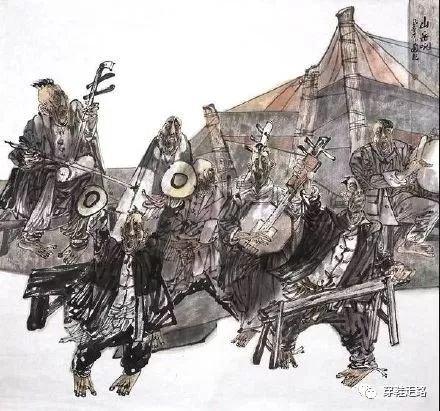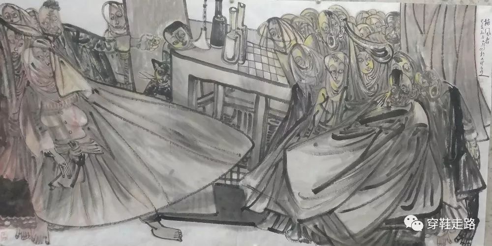 三是情色浓。不是说画里有故事吗,这些故事有故意的指向,指向的是那些年那些人,那些时时浮起的乡愁,那些欲说还休的情感,那些闪过的眼眸那些飘在风中的夜话……画不仅仅是记录,不仅仅是回味,一旦经过的水墨的渲染,就升腾一种浓郁的氤氲。他想说很多,又压抑在方尺画纸上,一个有心人探头进入,忽然就走进了一个长廊,那泓清泉,那叶小船,那片渔网,那个笑靥,那张老脸,那飘荡的裙子,都拥挤上来,为你引路为你导游,一步一步走进艺术庭院,一步一步走进灵魂花园。