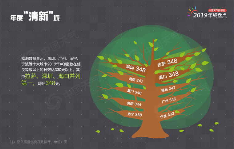 2019年度空气质量不错的城市,依然是南方城市多于北方,并且大多分布在西南和沿海城市。AQI指数在优良等级以上的日数达到330天以上的,海口、深圳、广州、宁波等城市毫无悬念入榜,其中拉萨、深圳、海口优良天数均达到348天,并列第一。