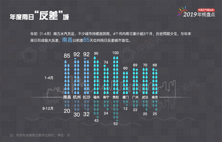 大家还记得2019年年初那个关于“太阳走丢了”的故事吗?年初(1-4月)由于副热带高压相对较强,南方水汽充足,造成不少城市出现连阴雨天气,部分地区4个月内雨日累计超3个月,历史同期少见。不过这个故事还有个后续,年末因为冷暖空气的配合不好,那些城市年初“走丢”的太阳是回来了,雨水却“失踪了”!因此年初年末的雨日形成了极大的反差,南昌、杭州和长沙是雨日“反差”最大的城市,其中南昌以相差65天位列首位。