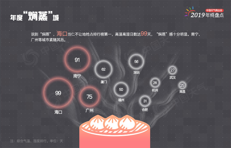 2019年“焖蒸城市”被南方城市囊括,海口当仁不让地抢占“焖蒸城市”排行榜第一,“焖蒸”感之最。南宁、广州紧随其后。夏季副热带高压上岸时,是容易出现桑拿天的时候。副热带高压是夏季的“大魔王”,在其控制下,气温都是一片红红火火。海口、福州、广州、深圳等地又盛行刮夏季风,都是从海洋上刮上来“潮湿风”,容易达到高温高湿的条件。