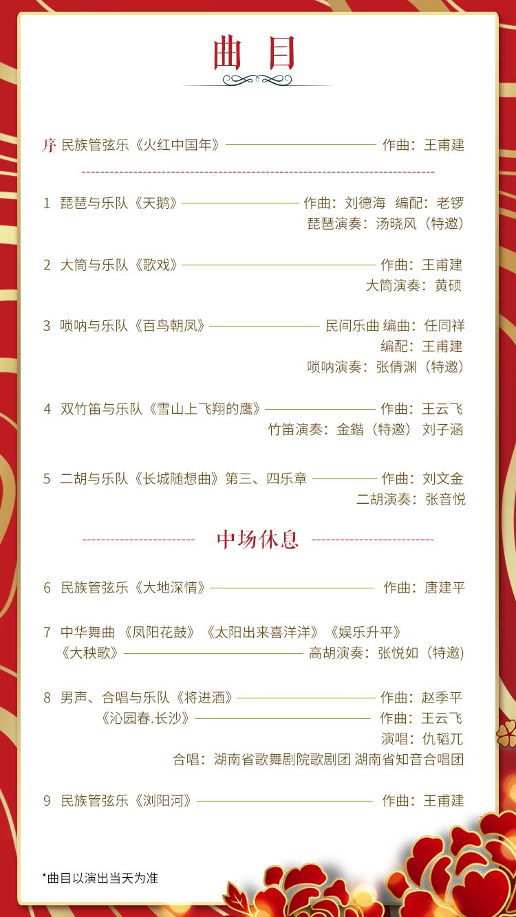 2020湖南省演艺集团新春音乐会由湖南省演艺集团主办,湖南省歌舞剧院民族乐团承办和演奏。这是一场张扬着民族激情的新春民族音乐会。音乐会融入中华民族千年传承的新年文化,将阖家团圆的喜庆氛围和美好祝福深深留在人们的心中。“过中国新年、听民族音乐”,不仅是一个理念,更逐渐成为老百姓过新年一个新的传统,一种新的习俗。自2017年开始,湖南省演艺集团决定以民乐音乐会这种的形式,陪观众过大年。