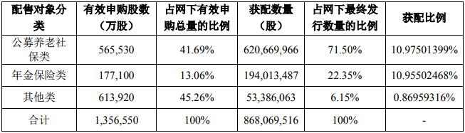 另经核查确认,358家网下投资者管理的1219个有效报价配售对象全部按要求参与了网下申购,最终公募养老社保类配售对象获配6.21亿股,占网下发行股数的71.5%。