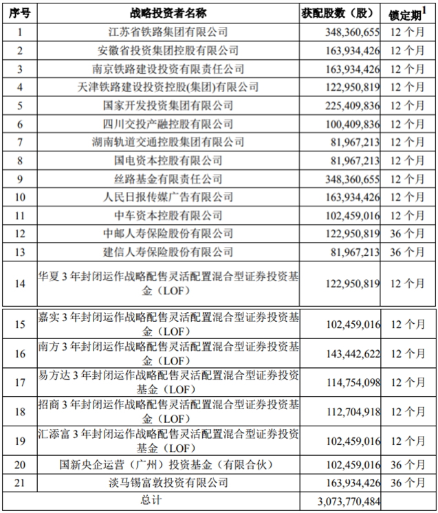 2020年1月8日,京沪高铁公布首次公开发行股票网下初步配售结果及网上中签结果公告显示,21家战略投资者获配30.74亿股,其中6只战略配售基金获配7亿股,占战略配售股数的22.73%,成为京沪高铁重要的战略投资者。