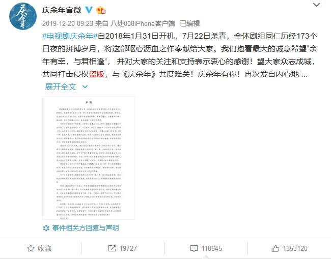 2019年一度大热的影视剧《庆余年》便是其中一个例子。该剧在视频平台播出后,网上出现了大量盗版内容,甚至在未播出完毕时,全集内容的盗版资源便已流出。该剧官微屡次发文号召抵制盗版,并称此类行为严重不尊重创作者,侵犯了权利人的合法权益,也涉嫌构成刑事犯罪、侵犯著作权罪、侵犯商业秘密罪,权利人再次向公安机关及人民法院报案并立案。