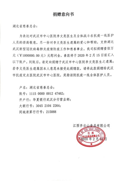 为积极履行企业社会责任,助力打赢新冠肺炎防疫攻坚战,向李文亮医生及奋斗在抗疫一线的医护工作者致敬,齐云山公司将开展系列公益捐赠工作。