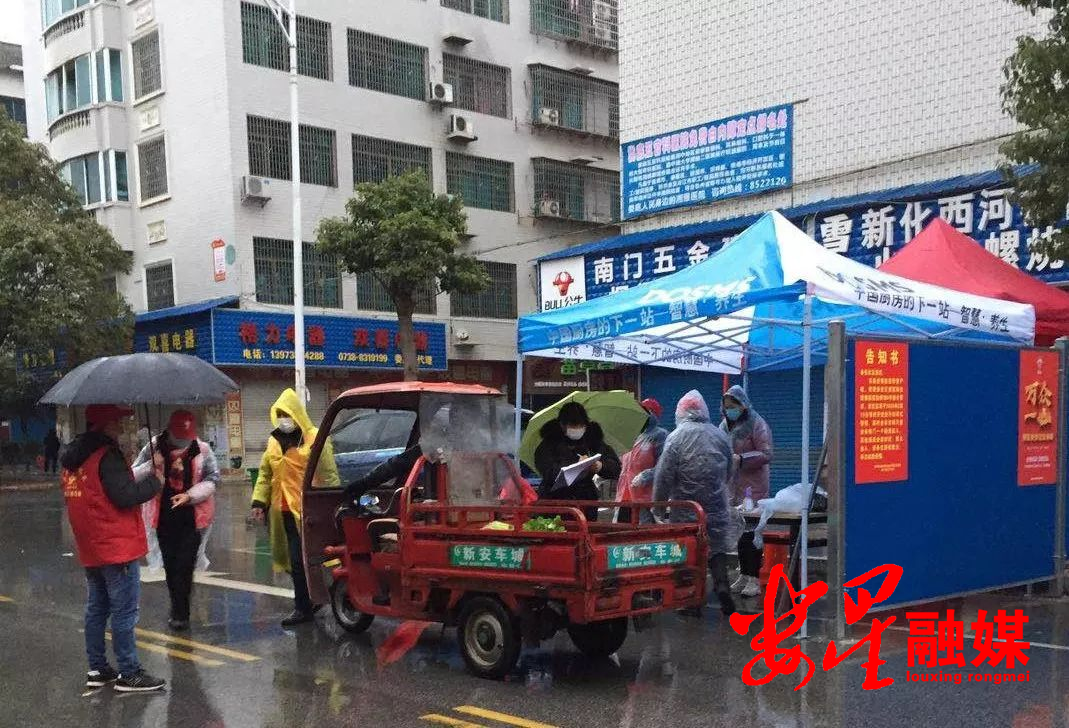 这里是娄星区乐坪街道金谷社区,常住人口6895人,流动人口达5000余人,内有金谷农贸市场为主体的摊位500多个、门面2000余个,共分为8个网格,其中1个网格是黄色网格。根据“外防输入、内防扩散”的要求,2月15日零时起,金谷市场纳入封闭式管理,除金谷南门一个通道出入,其他进出通道全部围挡封闭。社区将在金谷南门进出口设立检测登记点,值班人员实行三班倒,所有进入市场人员一律佩戴口罩、测量体温、进行登记,车辆逐一核查登记,对不佩戴口罩进入人员进行提醒劝返,对进出市场的人员和车辆实行双向审核登记。