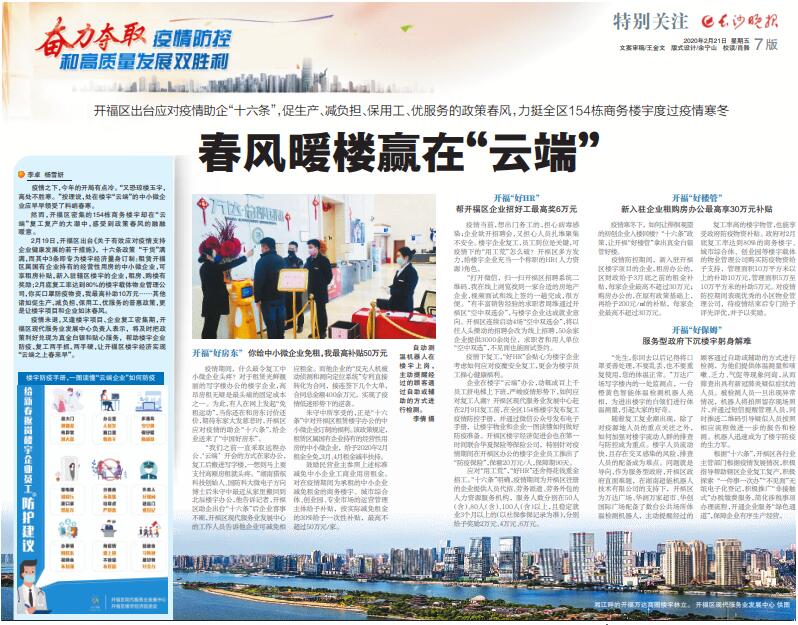 然而,开福区密集的154栋商务楼宇却在“云端”复工复产的大潮中,感受到政策春风的融融暖意。