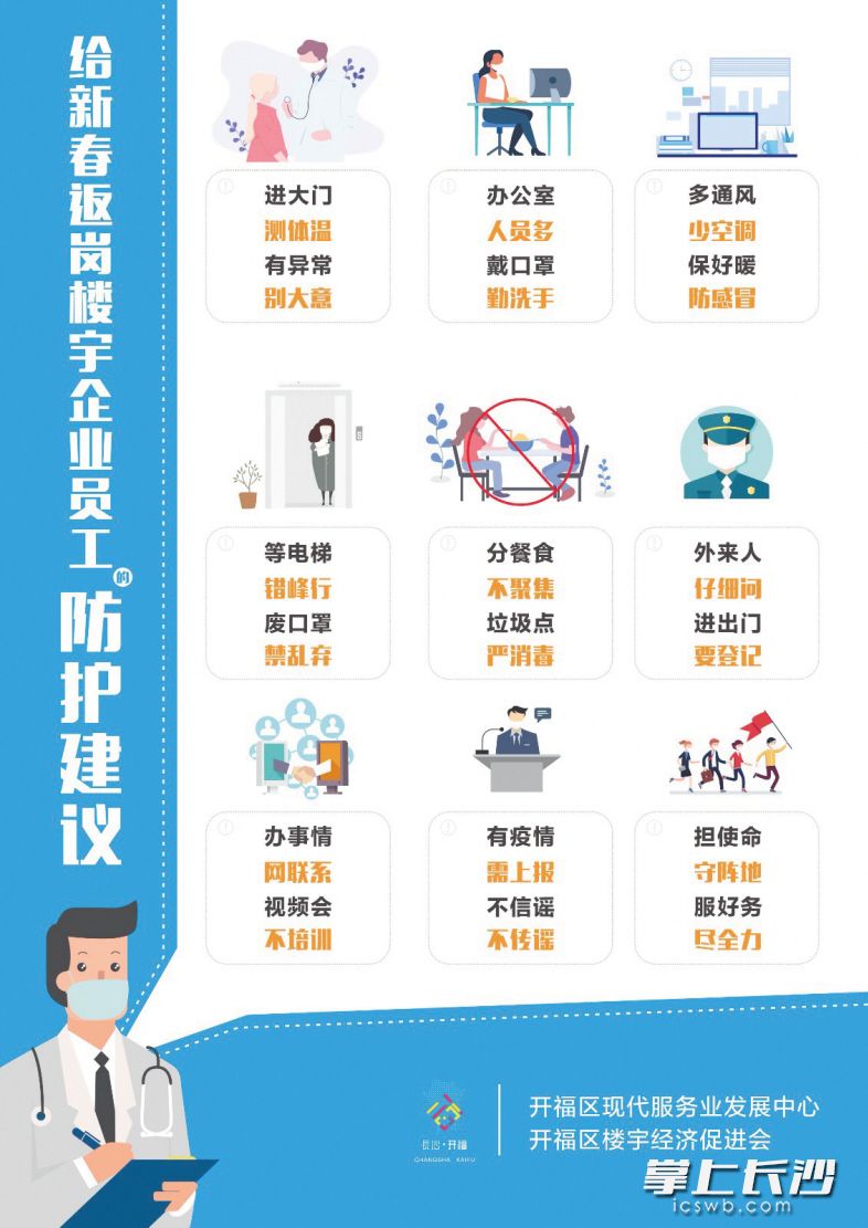 企业在楼宇“云端”办公,动辄成百上千员工挤电梯上下班,严峻疫情形势下,如何应对复工人潮?开福区现代服务业发展中心赶在2月9日复工前,在全区154栋楼宇发布复工疫情防控手册,并通过微信公众号发布电子手册,让楼宇物业和企业一图读懂如何做好防疫准备。开福区楼宇经济促进会也在第一时间联合华夏保险等保险公司,特别针对疫情期间在开福区办公的楼宇企业员工推出了“防疫保险”,保额20万元/人,保障期90天。