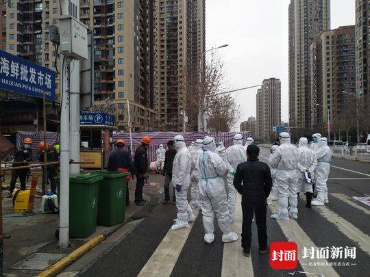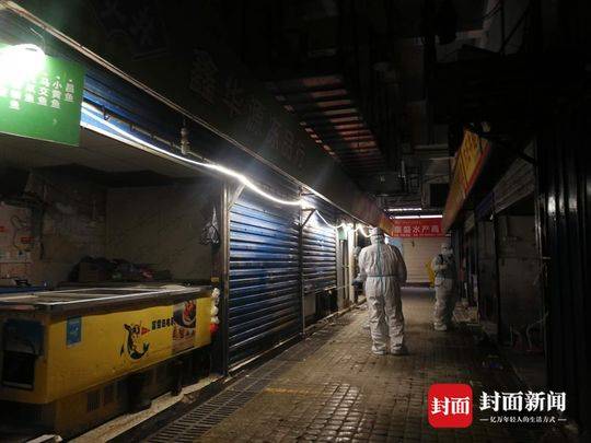 封面新闻记者在现场看到,3日下午14时开始,华南海鲜市场外集结了多支专业消杀队伍,市场东西区的入口处,开始各搭建防护通道。江卫消毒公司一名工作人员介绍,此前一个月,该公司员工每天都在市场内进行消毒。不过,由于所有商铺都处于关门状态,之前的消毒工作无法进入到店内操作。