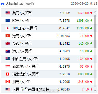 中国人民银行授权中国外汇交易中心公布,2020年3月20日银行间外汇市场人民币汇率中间价为:1美元对人民币7.1052元,较上一交易日的7.0522元下调530个基点。而美元指数继续强势,一度突破103。