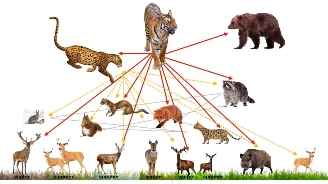 国家林草局东北虎豹监测与研究中心副主任冯利民说:生态系统不是简简单单的一些物种的堆积,物种之间的关系是息息相关、错综复杂的。维系生态系统有很多的规律,其中有两个比较重要的规律分别是上行效应和下行效应。