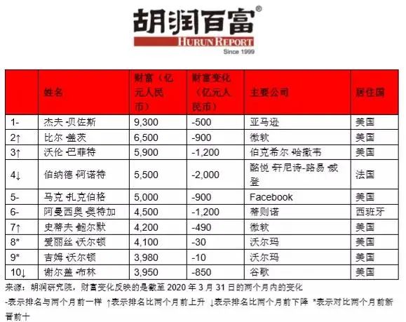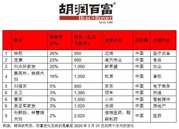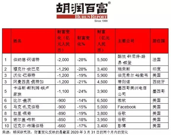 《疫情两个月后全球企业家财富变化特别报告》研究了胡润全球富豪榜上的企业家在截至2020年3月31日的两个月内的财富变化。
