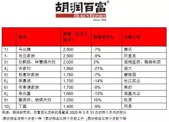 “全球百强企业家近两月损失2.6万亿人民币,前十名损失1.4万亿人民币。”4月6日,胡润研究院发布的《疫情两个月后全球企业家财富变化特别报告》显示,“马化腾则被动追上马云,首次并列中国首富。”