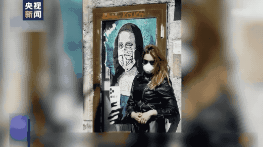 戴着口罩的蒙娜丽莎像前拍照留念