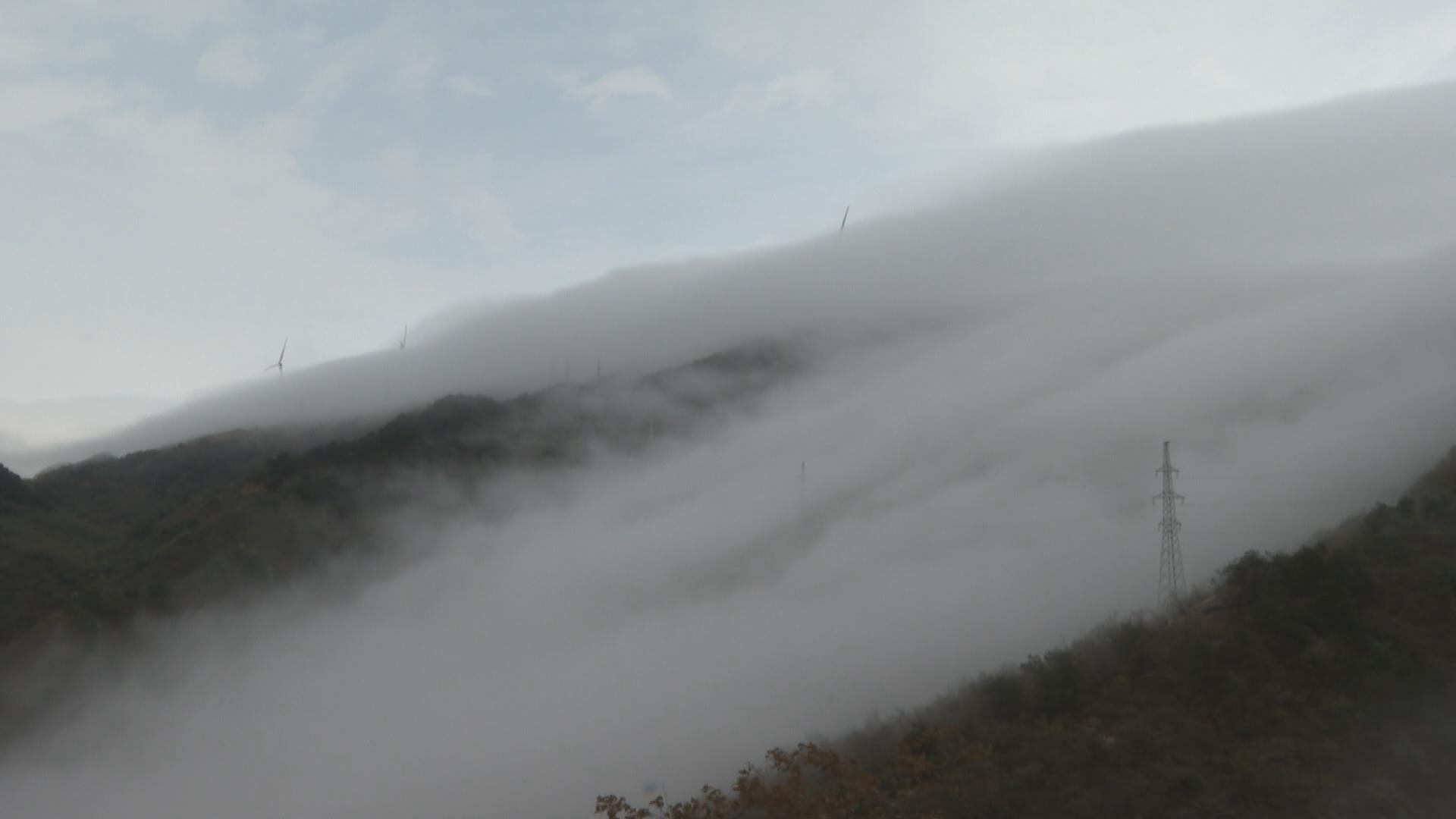 这些天乌鸡山上流云飘逸,在山口像水一样倾泻而下,形成大面积云瀑。绵绵浮云笼罩下的乌鸡山,郁郁葱葱,云雾凭借风力从高往低缓缓蔓延,犹如飞瀑驰骋于山间,山顶的风力发电机和输电铁塔在云雾中若隐若现,山沟盛开的紫杜鹃在雨雾的浸润下显得格外娇艳,云瀑奇观吸引不少过往游客停车驻足欣赏。