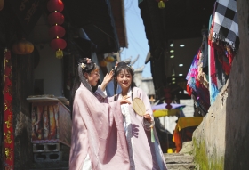 4月28日,湘西州永顺县芙蓉镇,两名游玩的女孩身穿古装。组图/记者陈正