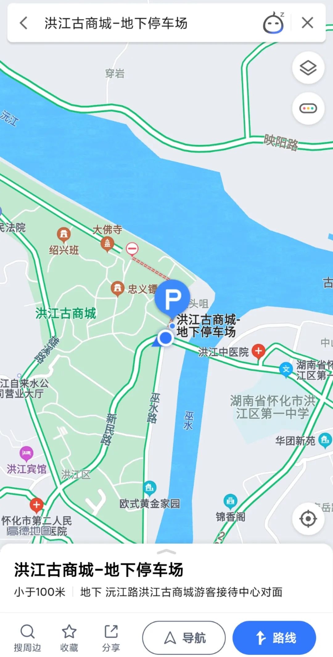 建议大家将车辆停放洪江古商城地下停车场。打开高德地图APP,搜索“洪江古商城地下停车场”即可。