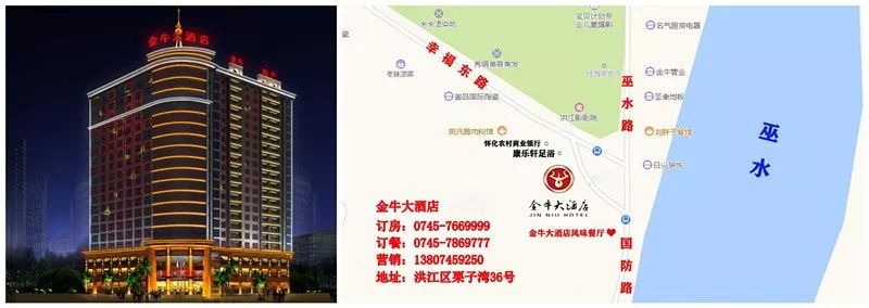 金牛大酒店:金牛大酒店是怀化市金牛房地产有限公司精心打造的一家三星级标准建造的集客房、餐饮、休闲娱乐于一体的高档商务酒店,地处洪江区古商城的嵩云山之下,巫水河之畔,紧靠1800米长繁花异景、麻石护栏的沿河风光带。