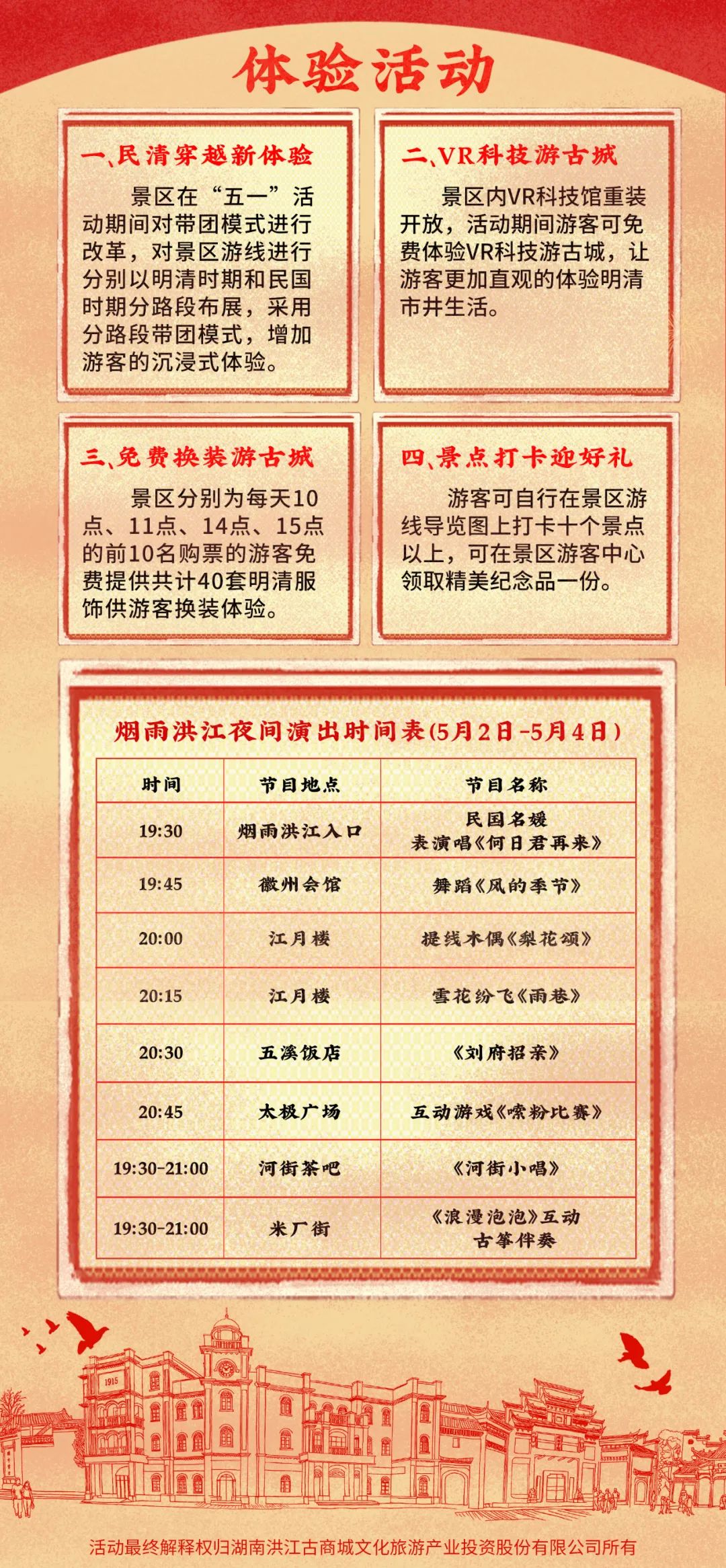 浪漫洪江:夜幕降临,华灯初上。夜幕下,“烟雨洪江”、新民路传统商业街流光溢彩、霓虹闪烁,时光恍若回转,似乎又见小城故事,“浪漫洪江”帷幕徐徐拉开,各种表演令人目不暇接,让游客充分体验洪江古商城的历史民俗和市井文化。5月2日至4日,“烟雨洪江”每晚都有表演,汉服同袍夜游洪江、古风巡游、汉服群舞、刘员外招婿、京剧表演、非遗木偶戏、清吧小唱等系列夜场节目将轮番上演,抢绣球、唱京剧、看群舞……各类表演带游客感受洪江古商城之夜。