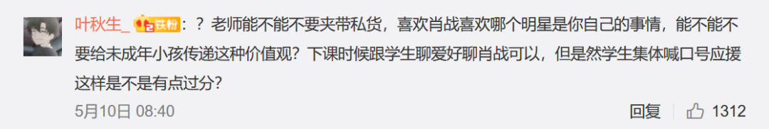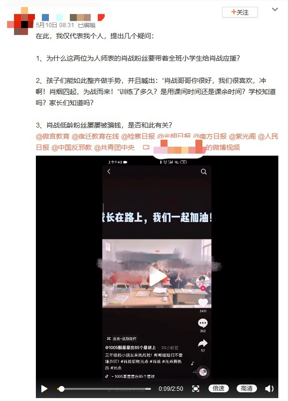 5月10日晚,该博主还发布了另一段某地老师组织学生为肖战应援的视频,里面的一段对话让不少网友感到震惊: