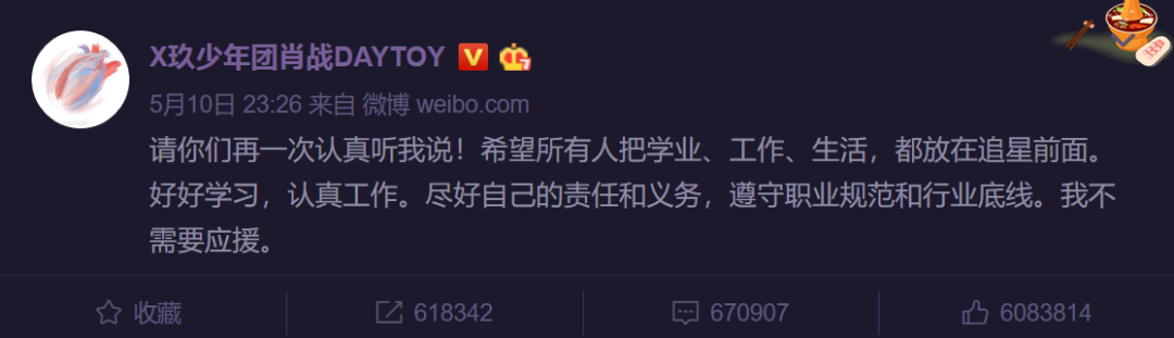 5月10日晚,肖战在社交平台发文回应了关于粉丝应援一事,表示自己不需要应援:“希望所有人把学业、工作、生活都放在追星前面。好好学习,认真工作。尽好自己的责任和义务,遵守职业规范和行业底线。”