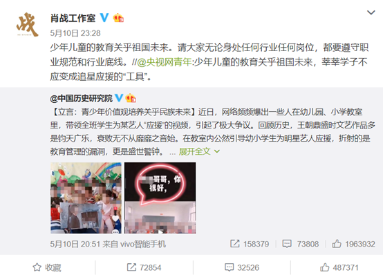 当晚,@中国历史研究院 官方微博发表了一条评论,强调“青少年价值观的培养,关乎民族未来……在教室内公然引导幼小学生为明星艺人应援,折射的是教育管理的漏洞,更是盛世警钟。”