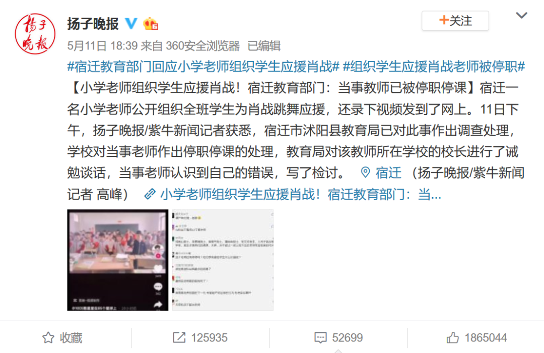 根据网友反映,其中一位让学生为肖战应援的老师,可能来自宿迁的情况,11日上午,有媒体联系到了宿迁市教育局的工作人员。
