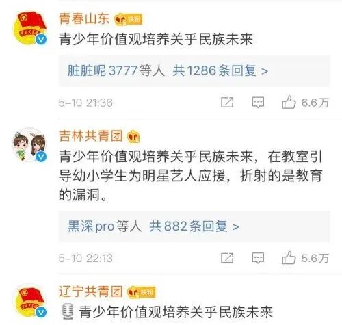 @青春山东、@吉林共青团、@辽宁共青团 等官博也纷纷跟帖,表示“少年儿童的教育关乎祖国未来,莘莘学子不应变成追星应援的‘工具’”。