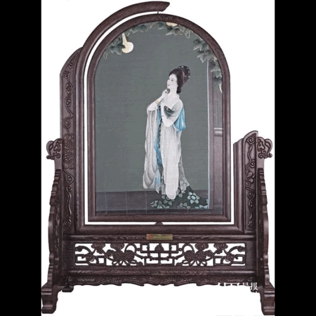 这幅作品一面是正面望月,一面是望月背影。首创湘绣双面全异绣人物的黄淬锋,从李白的《玉阶怨》“玉阶生白露,夜久侵罗袜。却下水晶帘,玲珑望秋月。”中获得灵感,创作出这幅缱绻秀丽的作品。