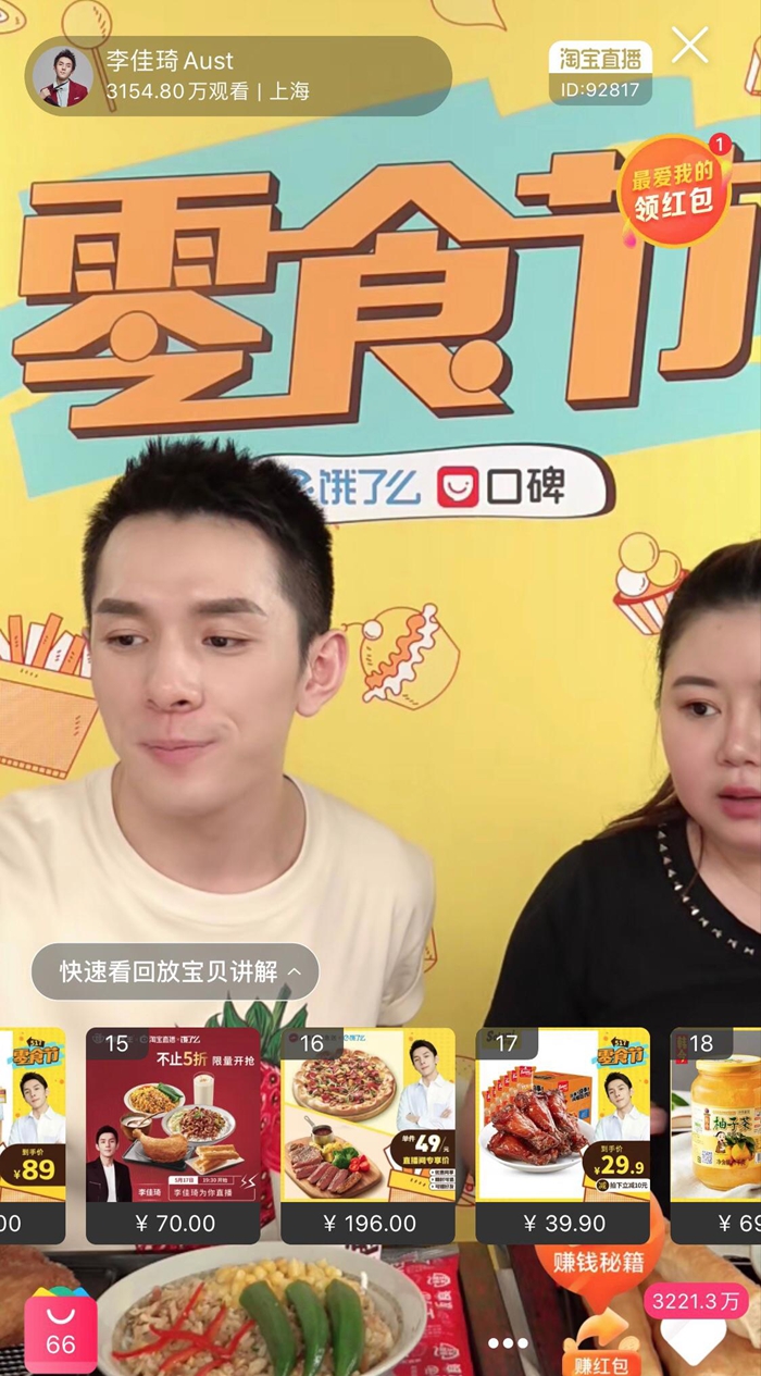 5月17日晚,超级主播李佳琦首次携手饿了么为必胜客、麦当劳、永和大王等餐饮品牌“吃播带货”,5分钟销量便破千万,创行业新纪录。开卖第1分钟便卖出15万只麦辣鸡腿堡,10万对麦辣鸡翅,2万份永和大王套餐,4万份西冷牛排和超级至尊披萨。