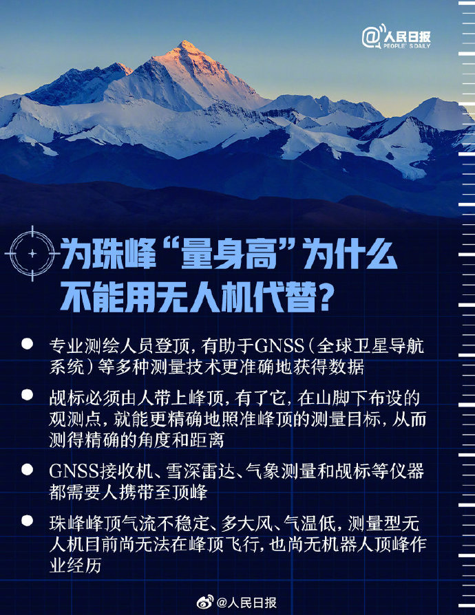 2020珠峰高程测量技术协调组组长党亚民介绍,卫星遥感精度不够,也只能测得雪面高度;峰顶空间较小,直升机无法降落,螺旋桨引起的风还可能引发冰雪崩塌。