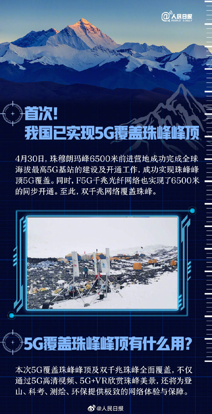 还有一个就是说我们测完了以后,可能我们的测量仪器可以在山上再多停留一会儿,我们可以多观测一些数据,通过我们的登山队员把一部分,把前面几十分钟的数据拿回来了,后面我们还会继续通过5G往下传数据,这样我们在峰顶的观测时间会长一些,然后呢,精度也就会高一些。