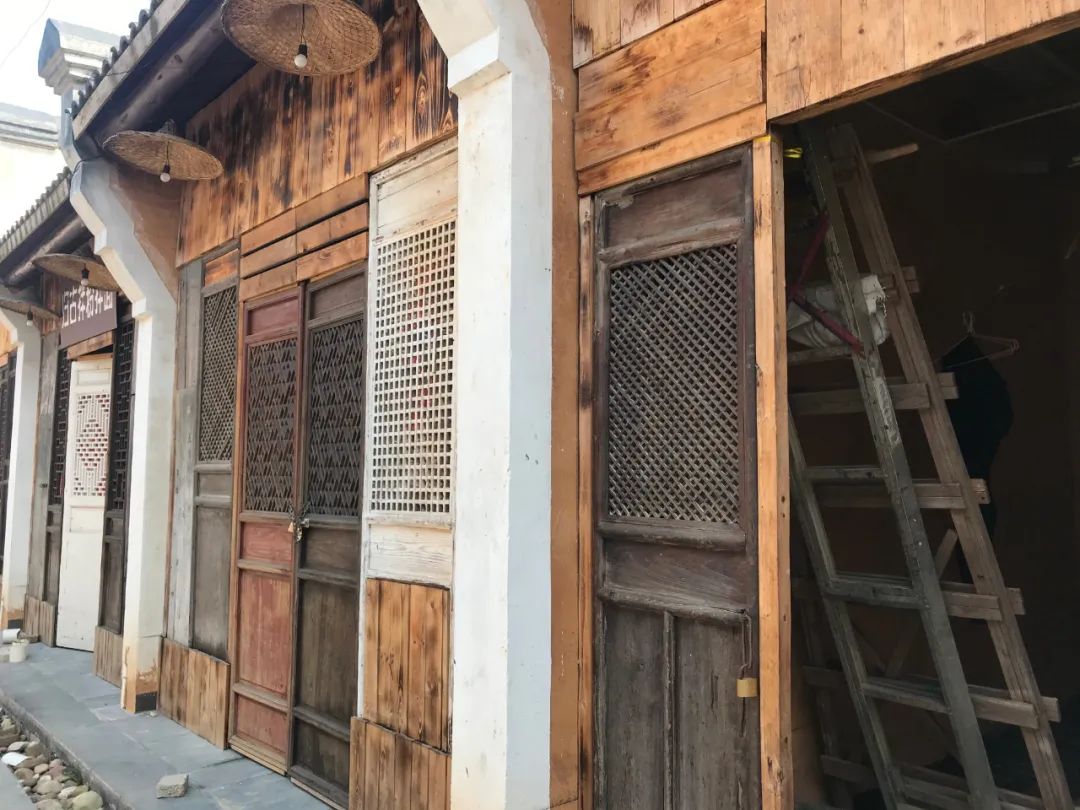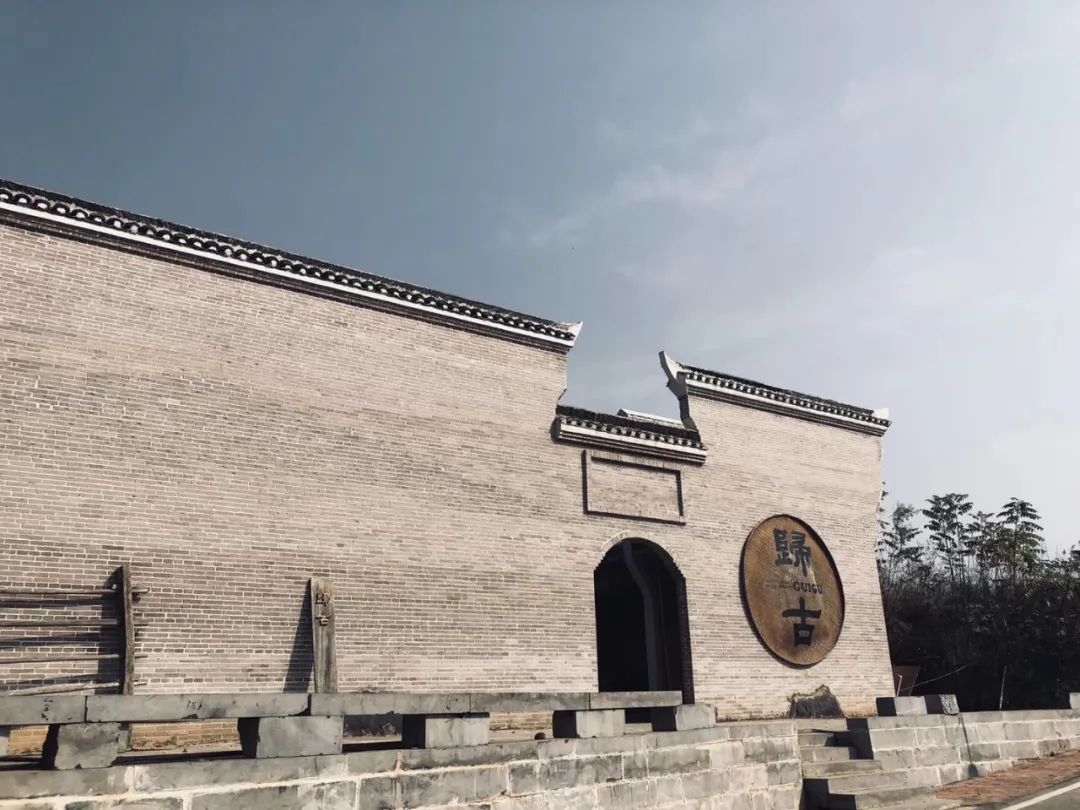 青砖黛瓦、飞檐斗拱、古色古香的仿古建筑物依山傍水。归古匠人古街的青砖墙上悬挂的巨型簸箕,正中题写两个黑体大字“歸古。”