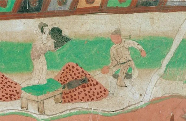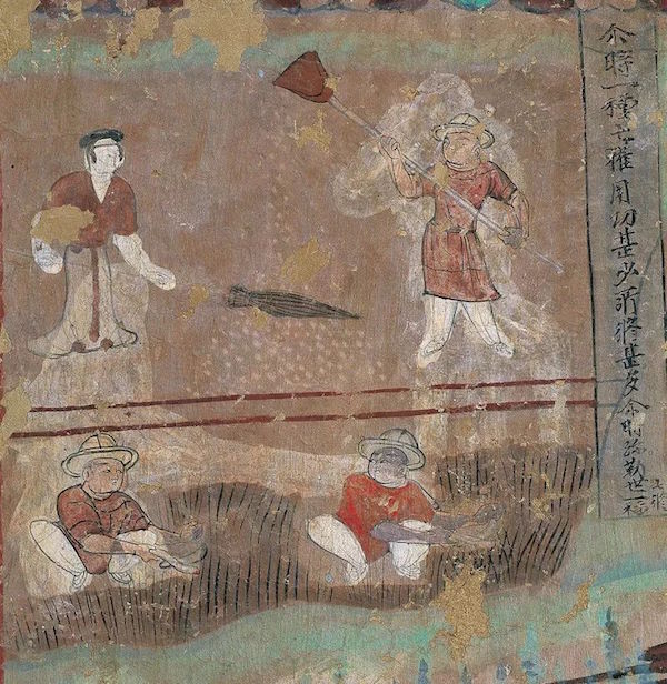 榆林窟第20窟五代《弥勒经变》中,为了表现未来一种七收的美好世界,绘制了农人收割和扬场的情景。画面下部两位农夫手持镰刀正在割麦,上部一农夫手持木锨扬场,一农妇执帚扫场。