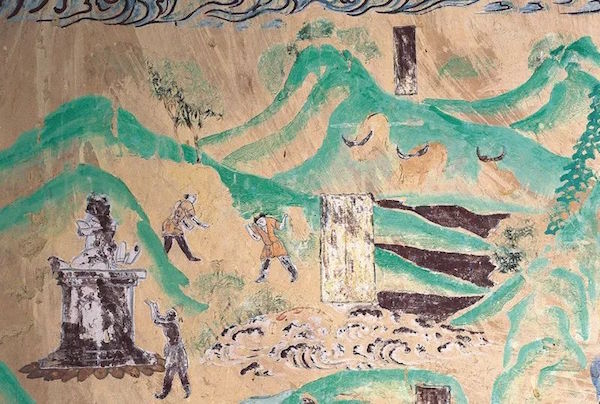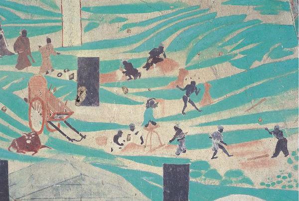 农忙之时,不仅农人要付出大把汗水,耕牛也不辞辛苦,风里雨里为收获服务。莫高窟第321窟的初唐壁画中,山下有人正在收割,山间几头耕牛于劳作间隙饮水休息,展现出一派耕牧景象。