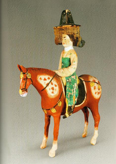 彩绘戴帷帽骑马仕女泥俑·唐(阿斯塔那206号墓出土新疆维吾尔自治区博物馆藏)
