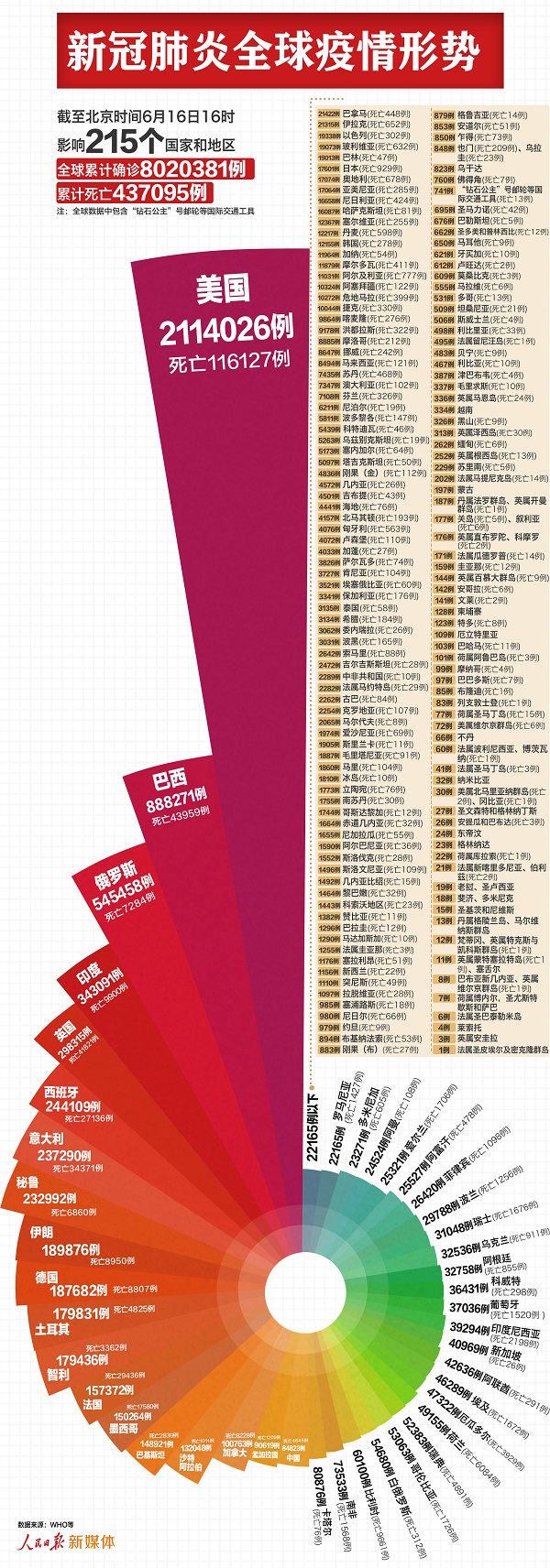 3.截至北京时间16日16时,215个国家和地区累计确诊8020381例,累计死亡437095例。