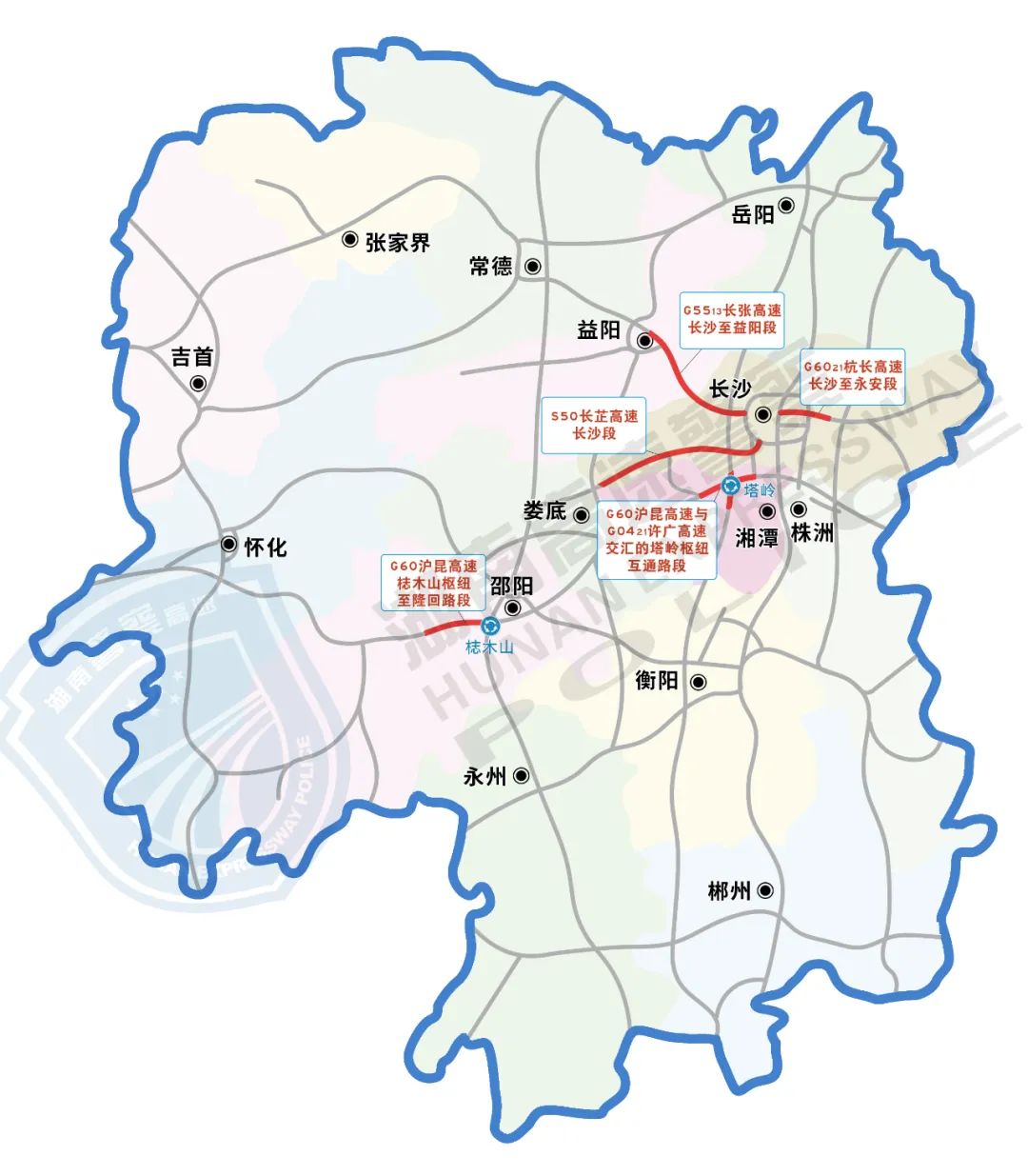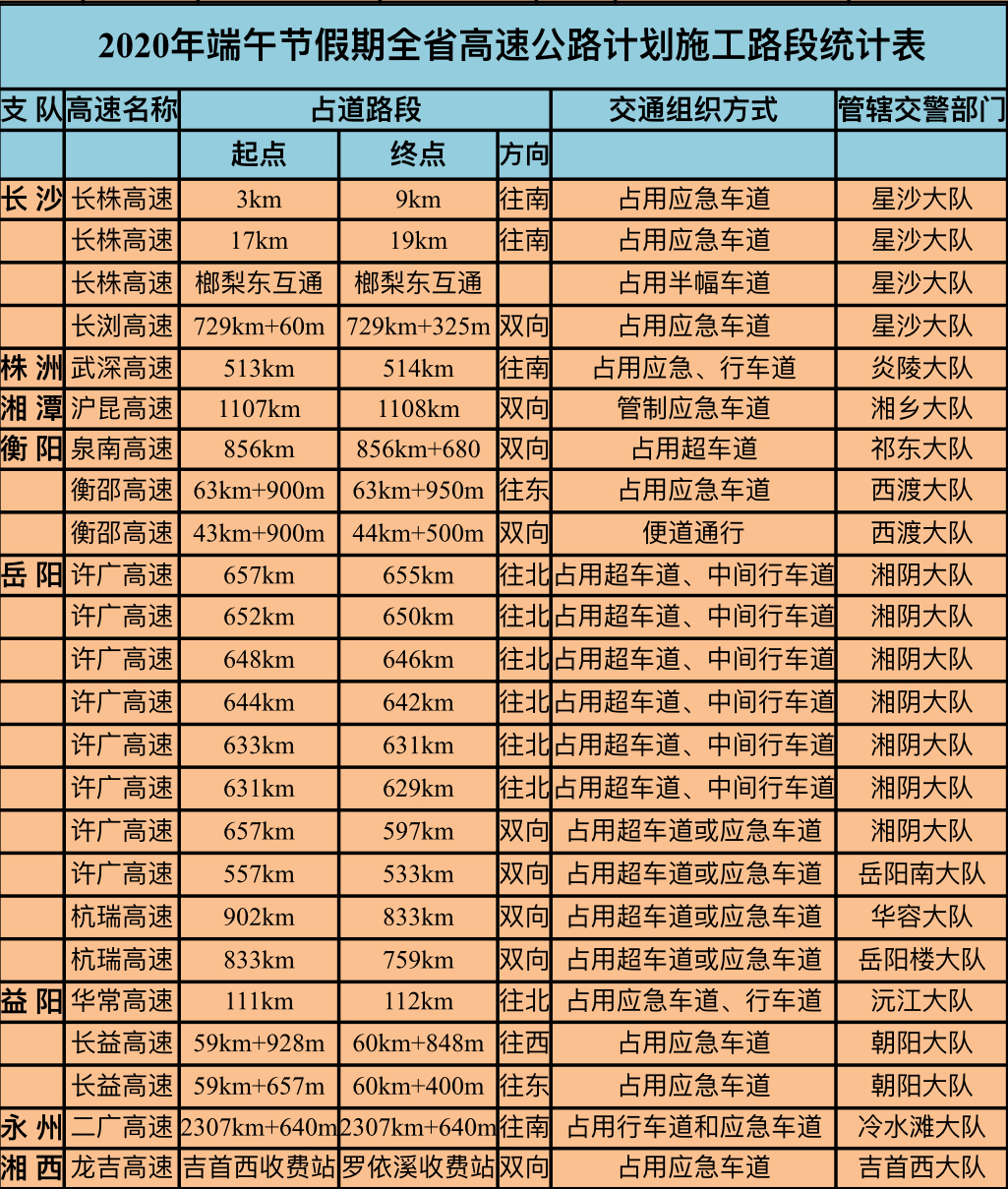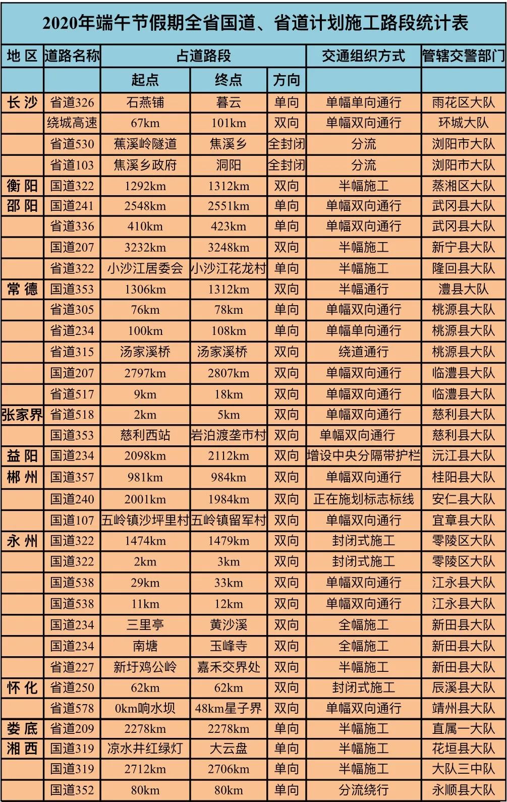 另外,据湖南省公安厅交警总队消息,端午假期,湖南有国道20处、省道14处、高速公路24处点段计划施工。请驾驶员经过相关路段时注意减速慢行或绕行。