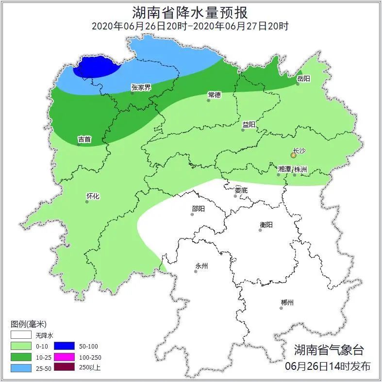 具体来看,6月26日20时至27日20时,湘西、湘北多云有阵雨或雷阵雨,其中湘西北部分地区有中等阵雨或雷阵雨,湘西州北部、张家界北部、常德北部局地大到暴雨,其他地区多云间晴天。