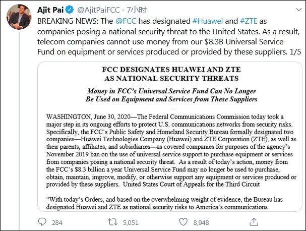 根据帕伊在社交媒体上补充的内容,这一决定意味着美国的通讯供应商将无法使用FCC通用服务基金83亿美元的补贴基金来购买华为和中兴的任何设备。